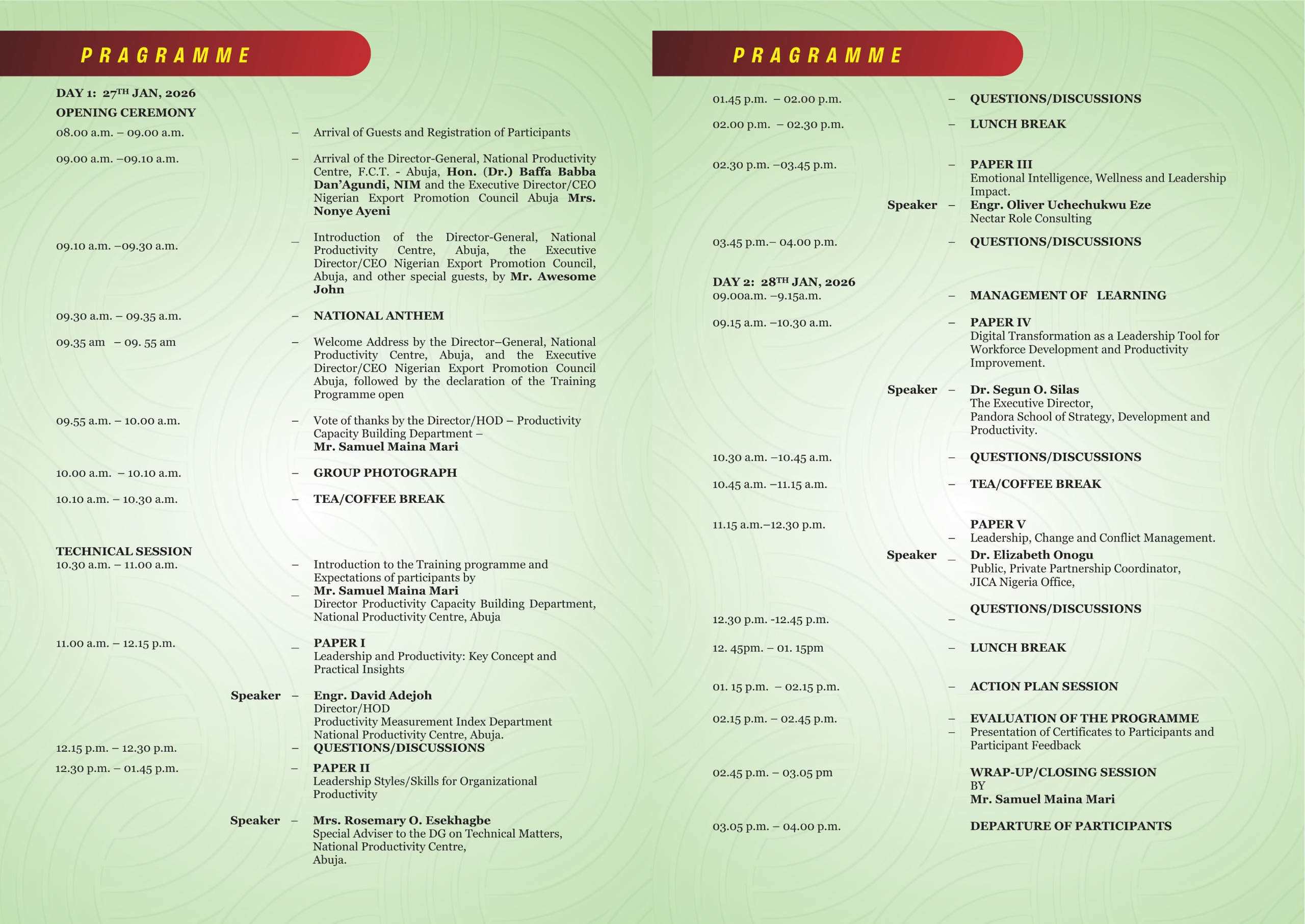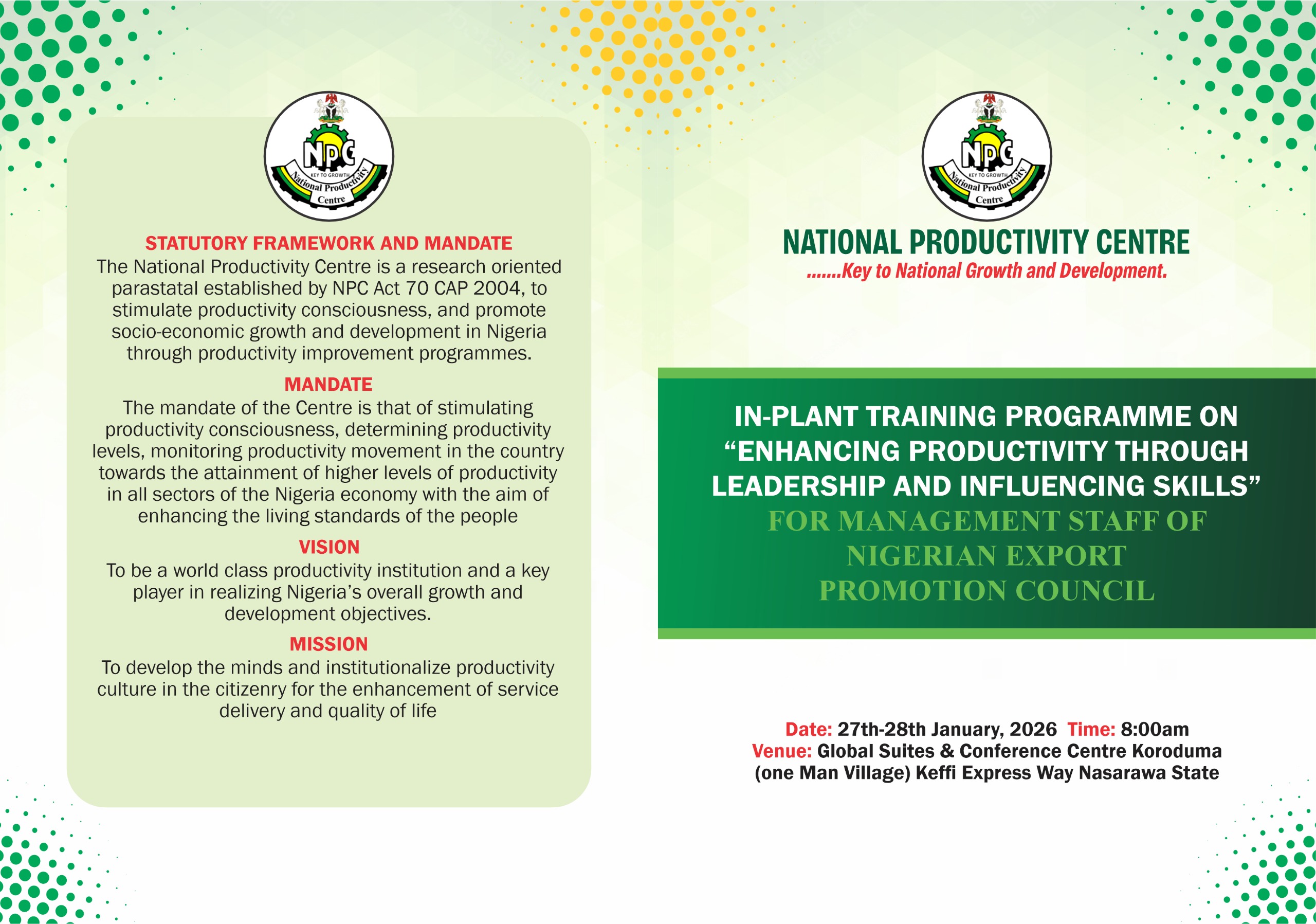 NPC TRAINS MANAGEMENT STAFF OF NIGERIAN EXPORT PROMOTION COUNCIL (NEPC).February 2, 2026 IN -PLANT TRAINING PROGRAMME ON :ENHANCING “PRODUCTIVITY THROUGH LEADERSHIP AND INFLUENCE SKILS FOR MANAGEMENT STAFF OF NIGERIAN EXPORT PROMOTION COUNCIL Share Related postsFebruary 2, 2026NPC TRAINS MANAGEMENT STAFF OF NIGERIAN EXPORT PROMOTION COUNCIL (NEPC).Read moreDecember 16, 2025NPC ORGANIZES A 3-DAY NATIONAL WORKSHOP TO ENHANCE ORGANIZATIONAL PERFORMANCERead moreDecember 6, 2025DIRECTOR-GENERAL, DR DAN’AGUNDI HONOURS RETIRING NPC DIRECTOR, PLEDGES NEW CAR IN RECOGNITION OF OUTSTANDING SERVICERead more